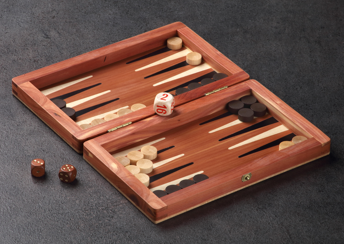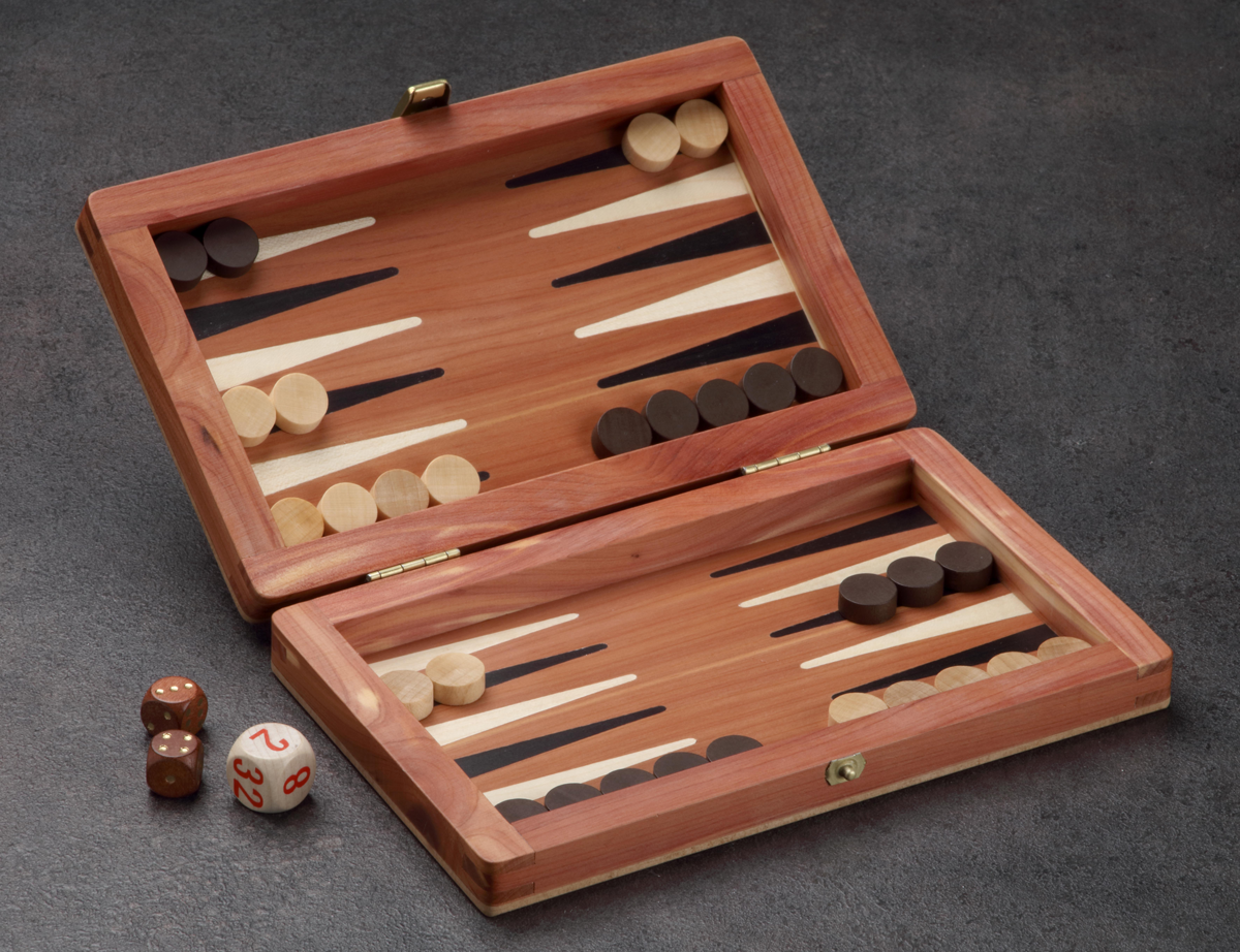 Handwerklich hochwertig verarbeitetes Reisebackgammonspiel in feinem Zedernholz. Die Zeder hat einen unvergleichlichen Geruch, er wirkt nervenberuhigend, stressreduzierend und ausgleichend.