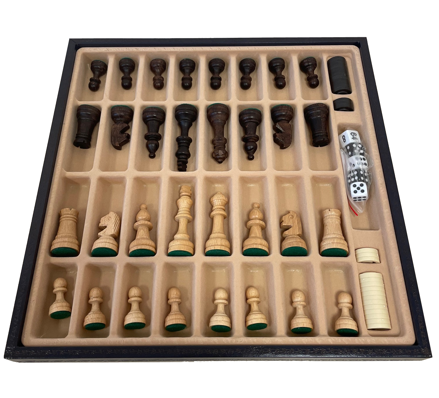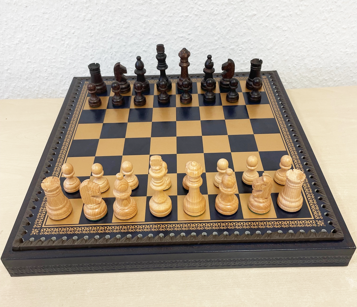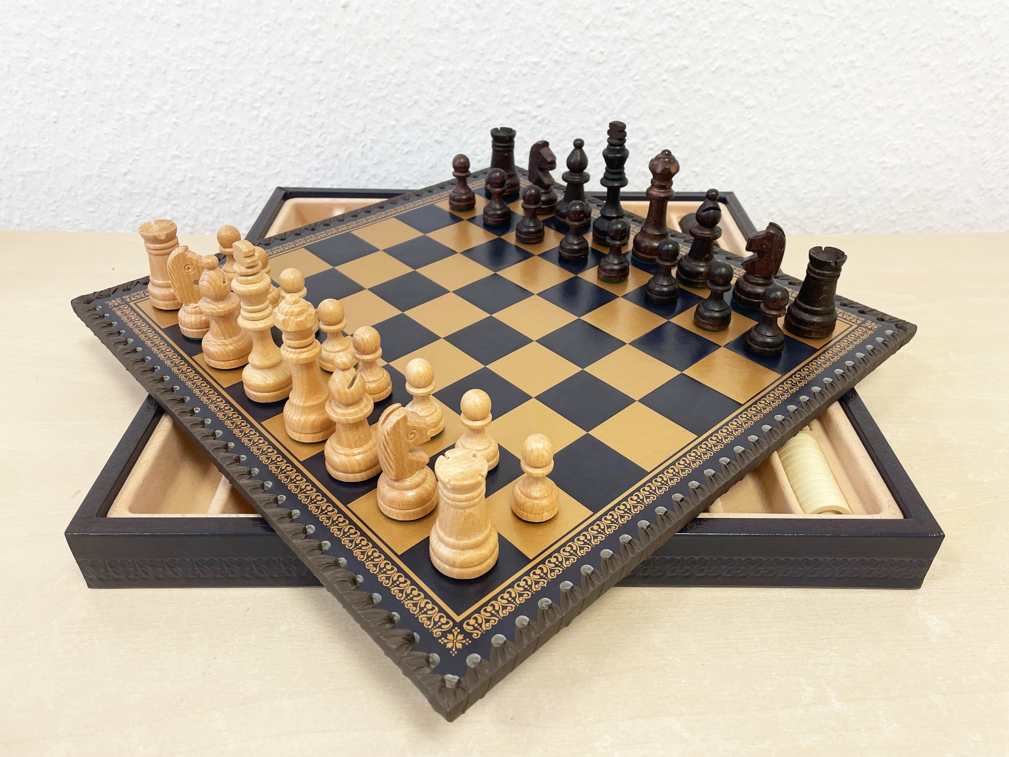 - Auf der Rückseite des Schachbretts befindet sich ein Backgammon-Spielfeld.
