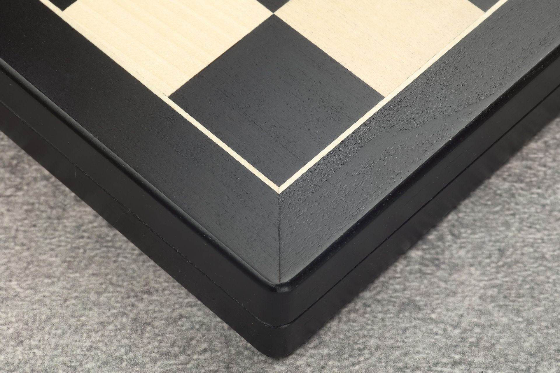 Handwerklich hochwertig verarbeitete Kassette mit einem Spielfeld (Feldgröße 45mm) aus Ahornholz und schwarzer Elsbeere mit Ahornrahmen, schwarz gefärbt und messingfarbenen Beschlägen. Das Schachfeld wurde bei dieser Schachkassette in aufwendiger Intarsienarbeit aus zwei Hölzern hergestellt mit einer umlaufenden Zierader.