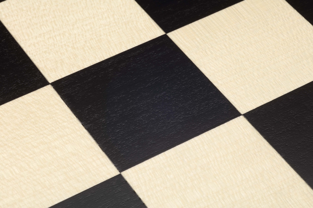Handwerklich hochwertig verarbeitetes Schachbrett mit einem Spielfeld aus schwarzer Elsbeere und Ahorn ohne Rahmen in modernem und zeitlosem Design. Das Schachfeld mit einer Feldgröße von 55 x 55 mm wurde in aufwendiger Intarsienarbeit aus zwei Hölzern hergestellt. Die sorgfältig ausgewählten Furniere lassen ein einmaliges Schachbrett entstehen. Diese Holzkombination strahlt viel Eleganz und Purismus aus und vermittelt Kontrast und Klarheit.