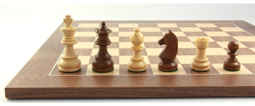 Dazu das passende, hochwertige Schachbrett aus amerikanischem Nussbaum und Ahorn natur, mit 3er-Ader schwarz/weiß/schwarz zwischen Rand und den Feldern, feine Intarsienarbeit, matt lackiert und mit 40 mm breiten Rand.