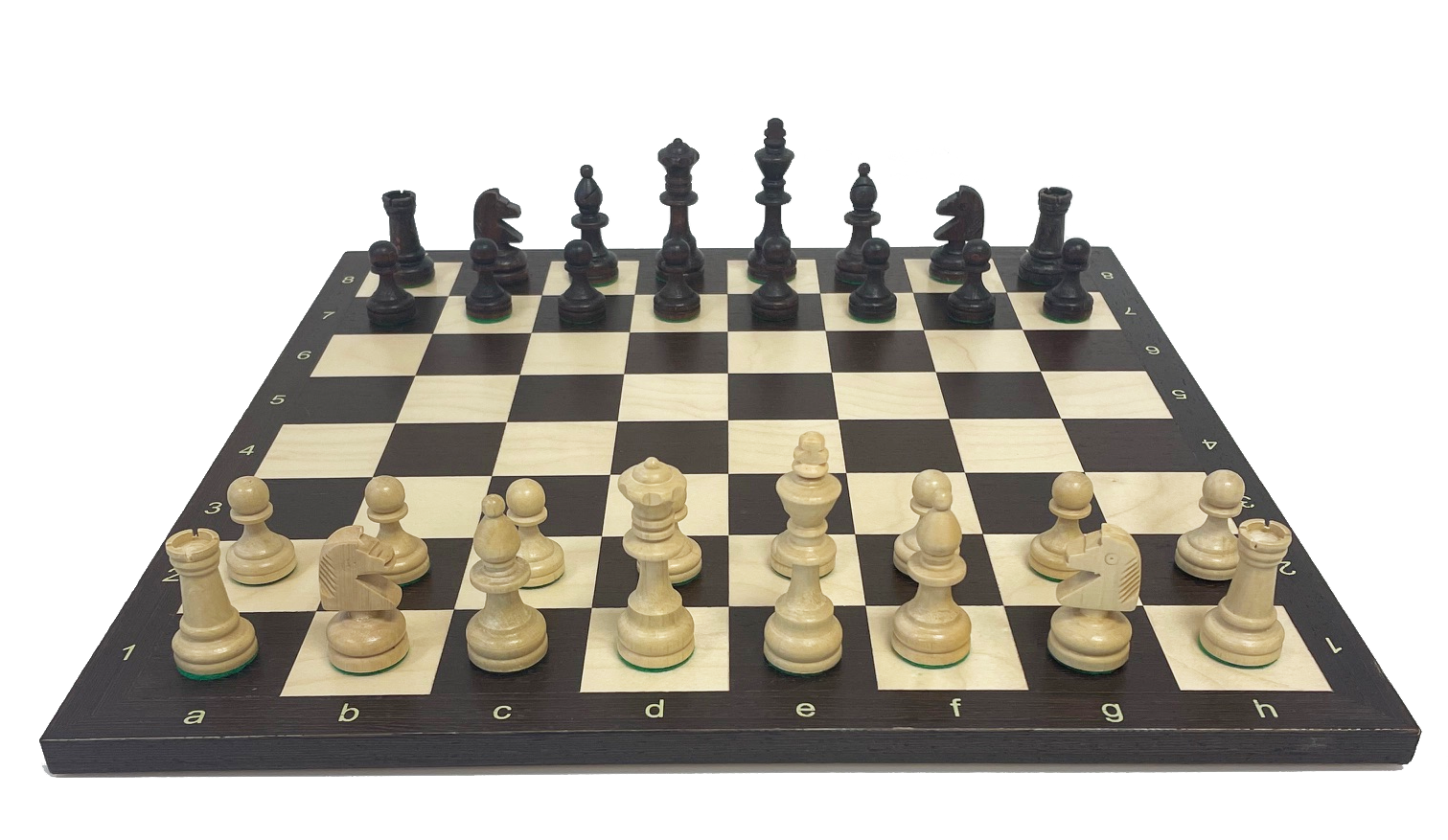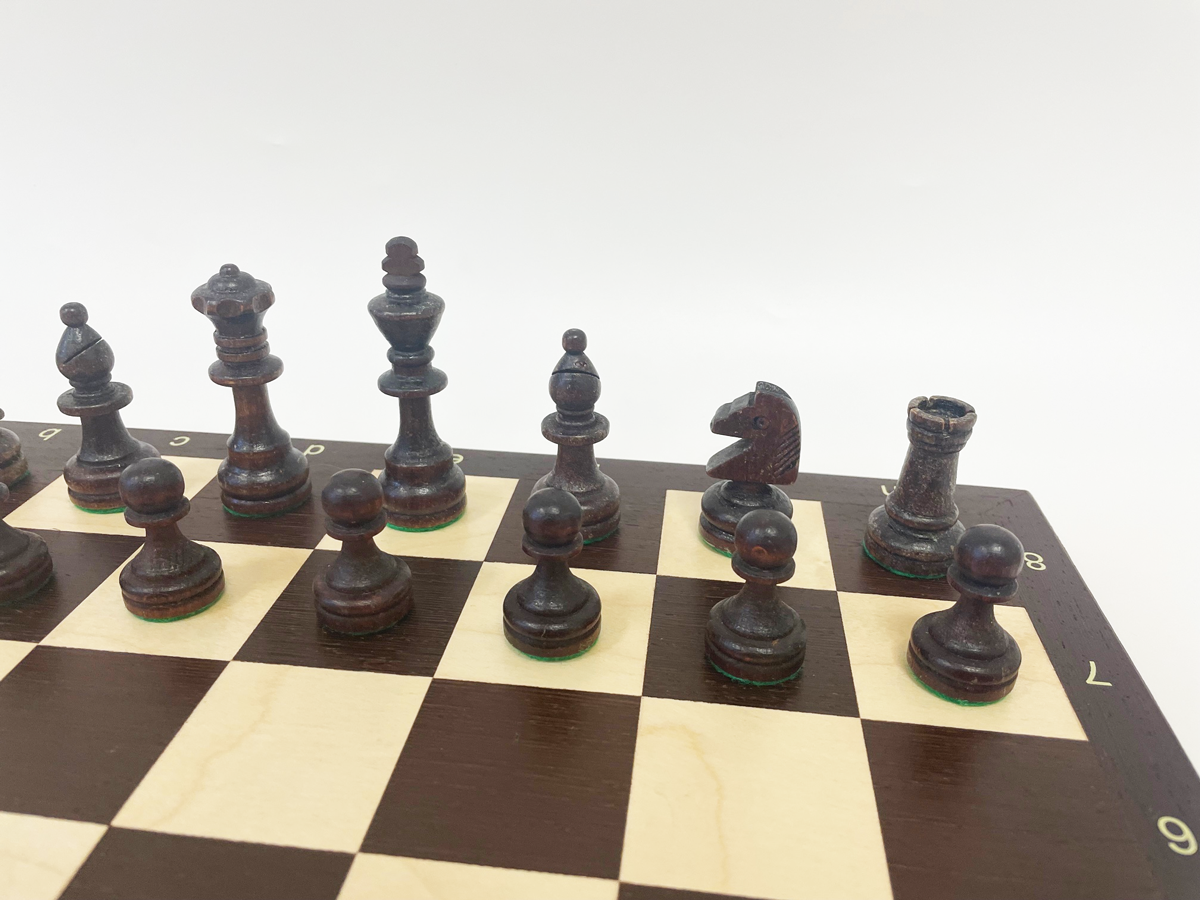 Holzschachfiguren Staunton Form Königshöhe 76 mm, sind beschwert und mit Filz unterlegt. Die Figuren werden in einem Baumwollbeutel für die Aufbewahrung der Figuren geliefert. Das passende Schachbrett in Wenge und Ahorn Intarise (mit Zahlgen und Buchstaben) hat eine Feldgröße 45 mm.