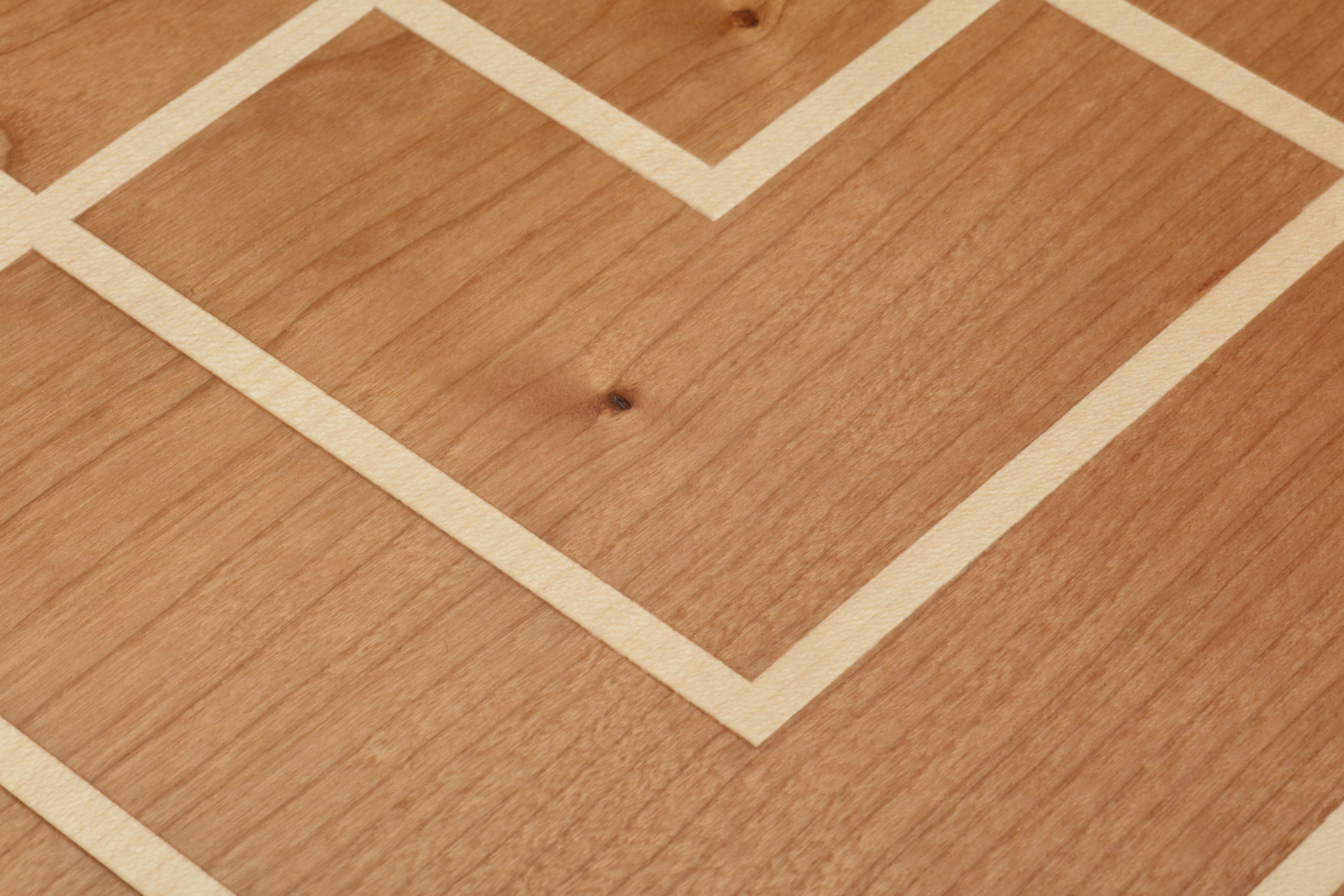 Hier überwiegt das warme und feine Kirschbaumholz und bekommt durch den Ahorn seine Linien.