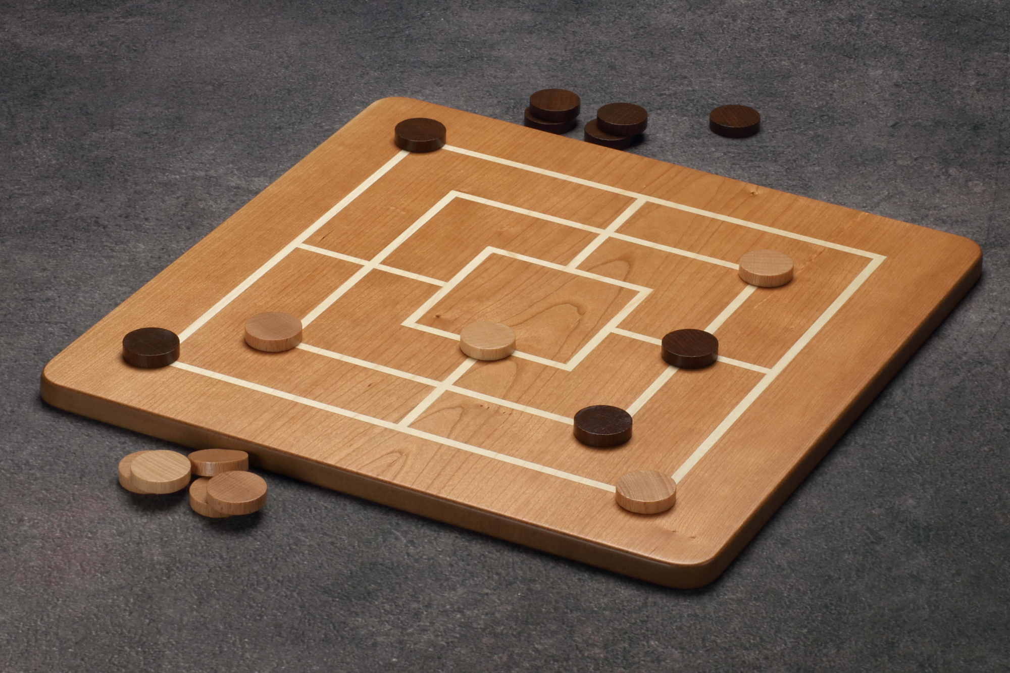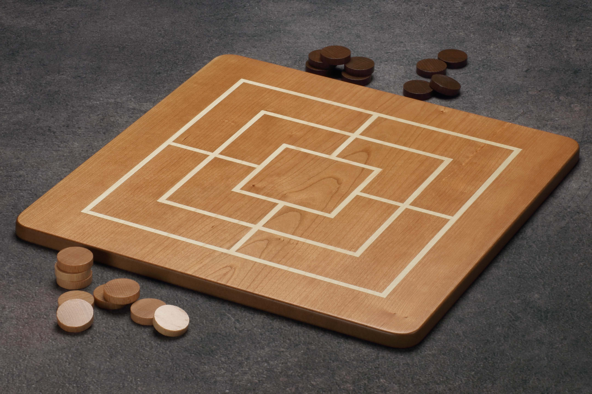 Der Spieleklassiker Mühle in handwerklich hochwertiger Ausführung und mit aufwendiger Intarsienarbeit: Alle Mühleadern werden von Hand eingelegt.