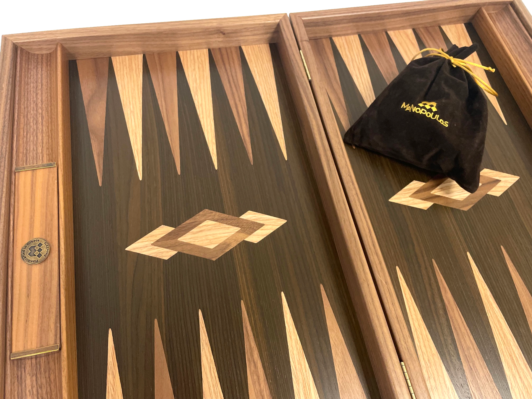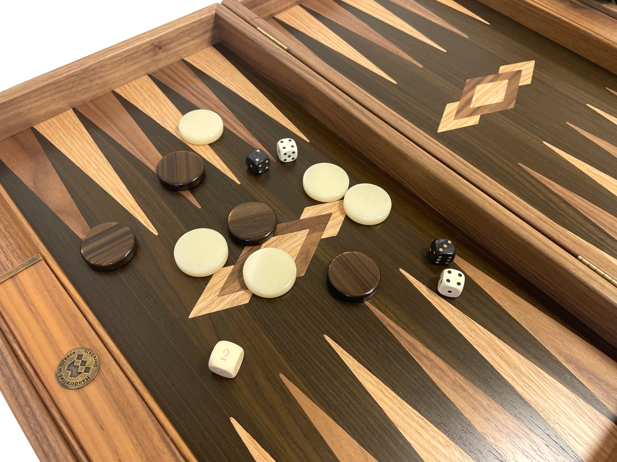 Dieses Backgammon Nussbaumholz und natürlichen Baumstamm in Größe 48x30 cm wurde in Handarbeit in Griechenland hergestellt, wobei die Kunst der Intarsien (auch Marqueterie genannt) genutzt wird.